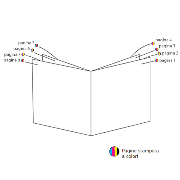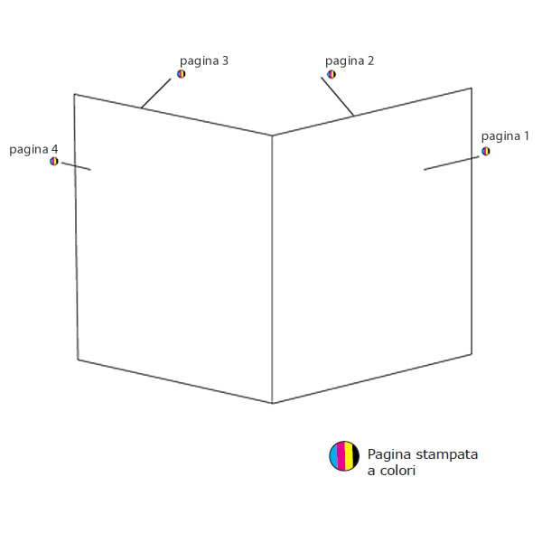 Può essere stampato solo su un lato (4/0) in modo da ottenere 2 pagine stampate (le interne restano bianche) o su entrambi i lati (4/4) in modo da ottenere